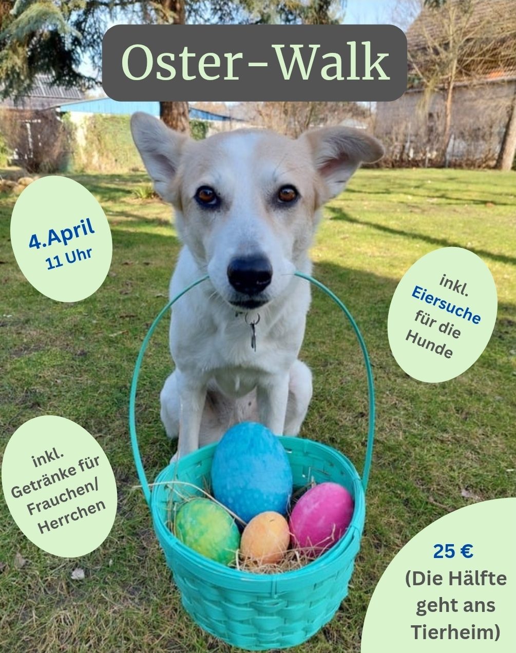 Bitte teilt mir vorher mit, ob euer Hund normale Leckerlies verträgt oder Allergiker ist, da die Ostereiersuche auch ein paar Lecklerlies beinhaltet.